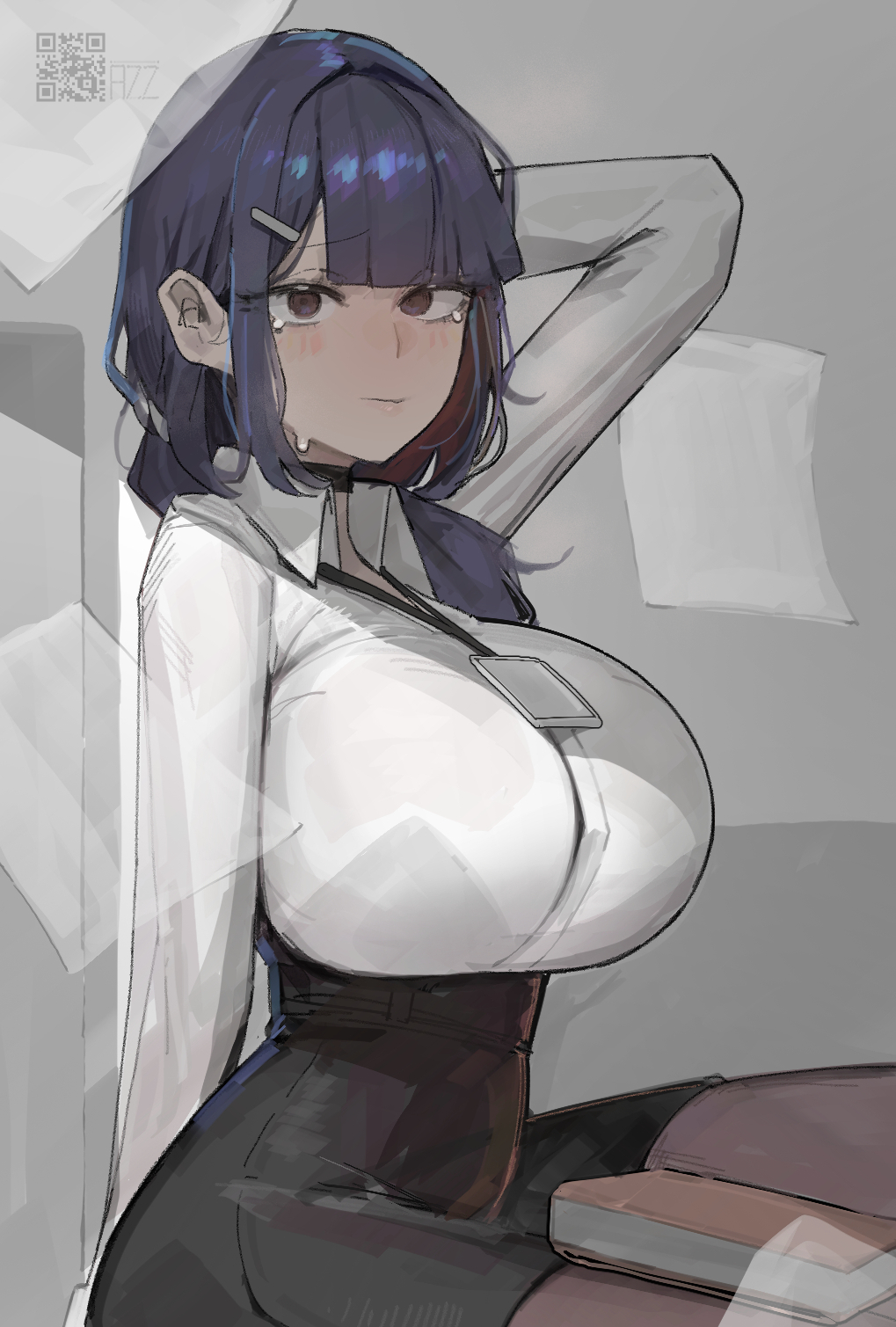 1girlarm behind headarm supportarm upartist namebadgeblack chokerblack hairblack pantyhoseblunt bangsblushbookbreastsbrown eyeschokerclosed mouthcollared shirtembarrassedeyelashesfurrowed browhair behind earhair ornamenthair over shoulderhaircliphigh-waist skirthuge breastsimpossible clothesjewelrylong hairlong sleeveslooking at viewernecklaceoffice ladypantyhosepencil skirtqr codeshirtsidelockssittingskirtsolotearswhite shirt