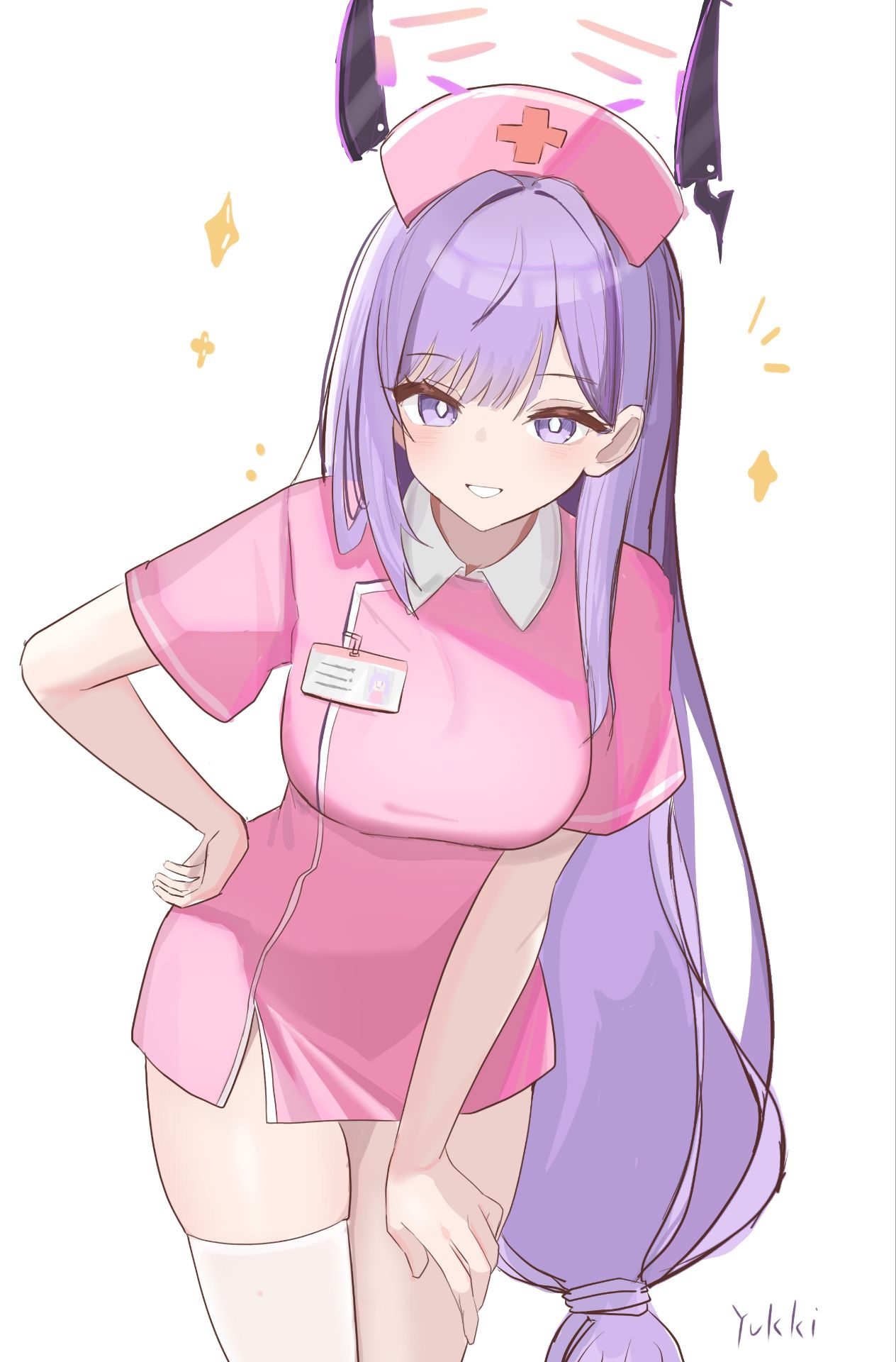 1girlalternate costumeartist namebare armsblushbreastsbright pupilsdresshalohand on own thighhatlong hairlooking at viewerlow-tied long hairmedium breastsnursenurse cappink dresspurple eyespurple hairshort sleevessimple backgroundsingle thighhighskindentationsmilesolosparklethighhighsvery long hairwhite backgroundwhite pupilswhite thighhighs