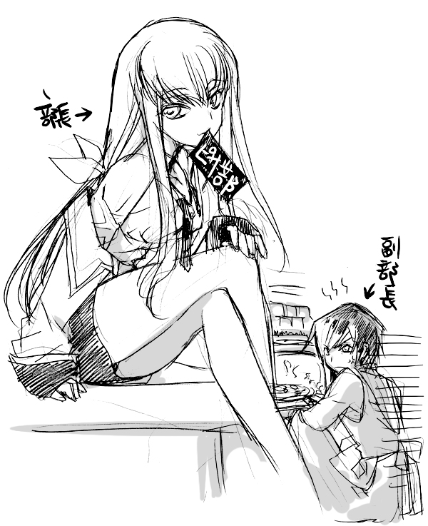 00s1boy1girlapronchinese textcrossed legsgreyscalehair ribbonlegslong hairlong sleevesminiskirtmonochromemouth holdribbonsittingsketchskirtsleeves past wristssmilewhite background