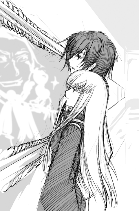 abubu, takara miyuki, lucky star, translation request, 00s, 1girl, cellphone, female focus, glasses, greyscale, monochrome, phone, school uniform, serafuku, simple background, sketch, solo
