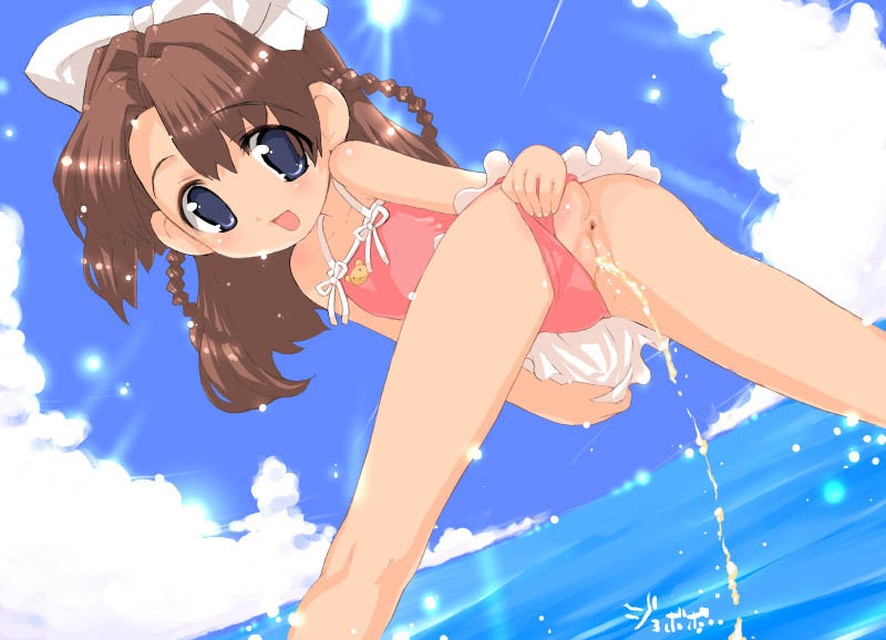 1girlanimal printanusassbear printbent overblack eyesblue eyesblushbowbraidbrown hairclothing asidecloudfrom behindhair bowlolioceanone-piece swimsuitpeeingpink one-piece swimsuitprint swimsuitpussyribbonskysmilestandingswimsuitswimsuit asideswimsuit skirttwin braidsuncensoredwaterwhite bow