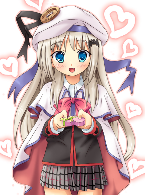 1girlblonde hairblue eyesbowboxcapechocolatefangfemale focushatheartlong hairpink bowplaid clothesplaid skirtschool uniformskirtsolovalentine