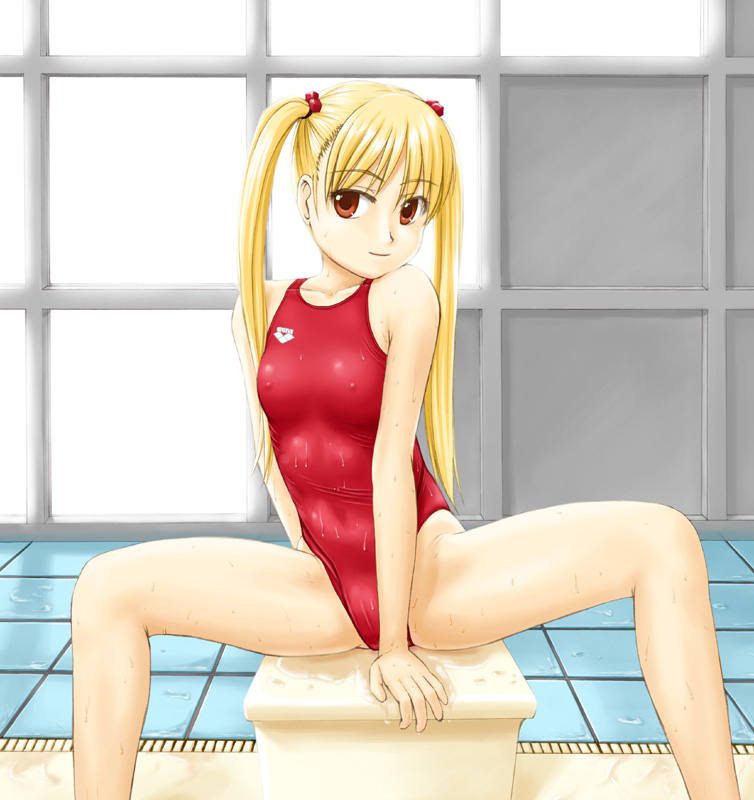 1girlblonde hairbrown eyescompetition swimsuitcovered erect nipplesfemale focusflat chesthighleghighleg one-piece swimsuitlong hairone-piece swimsuitsolospread legsswimsuittwintailswet