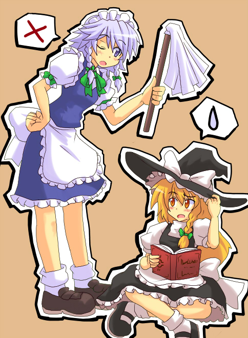 2girlsblonde hairblue eyesblushbookfemale focushairbandhatmultiple girlsone eye closedopen bookreadingribbonspeech bubblespoken sweatdropsweatdropwinkyellow eyes