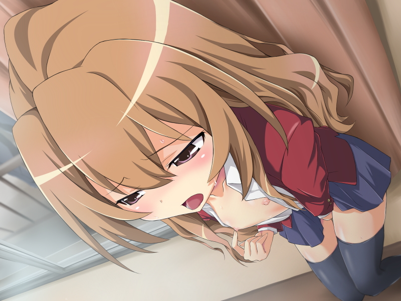 misooden, character request, copyright request, 1girl, blue eyes, blush, brown hair, downblouse, female focus, flat chest, loli, nipple slip, nipples, no bra, rice, smile, solo