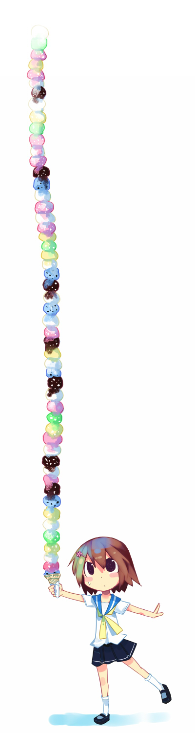 1girlbalancingblushbrown hairfemale focusfoodice creammultiple scoopsschool uniformserafukusimple backgroundsolostandingstanding on one legsweattoo manytoo many scoops