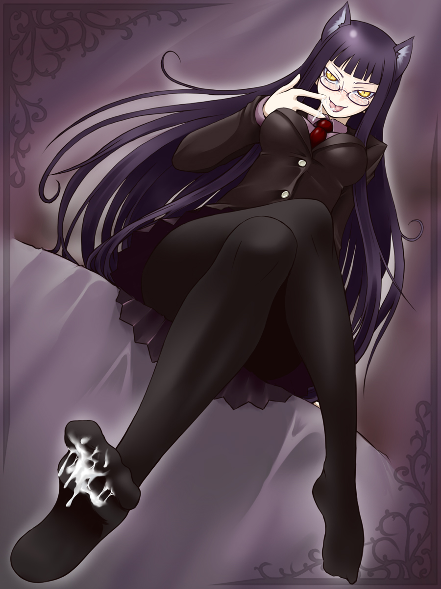 1girlanimal earsbad anatomybad feetcat earscrossed legscumcum on bodycum on clothescum on lower bodyfeetfemale focusglasseslong hairpantyhosepoorly drawnpurple hairsittingsolotonguevery long hairyellow eyes