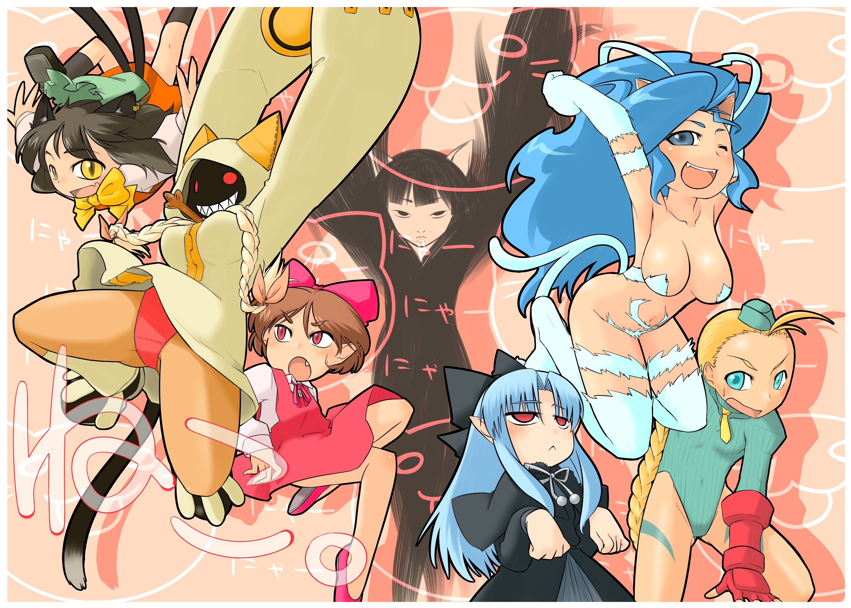 00s6+girlsanimal earsanimal handsblonde hairblue hairblue leotardbowbreastscat earscat tailcrossoverleotardmultiple crossovermultiple girlsnecktieodd one outpantiespink bowred eyesribbontailunderwearyellow eyes