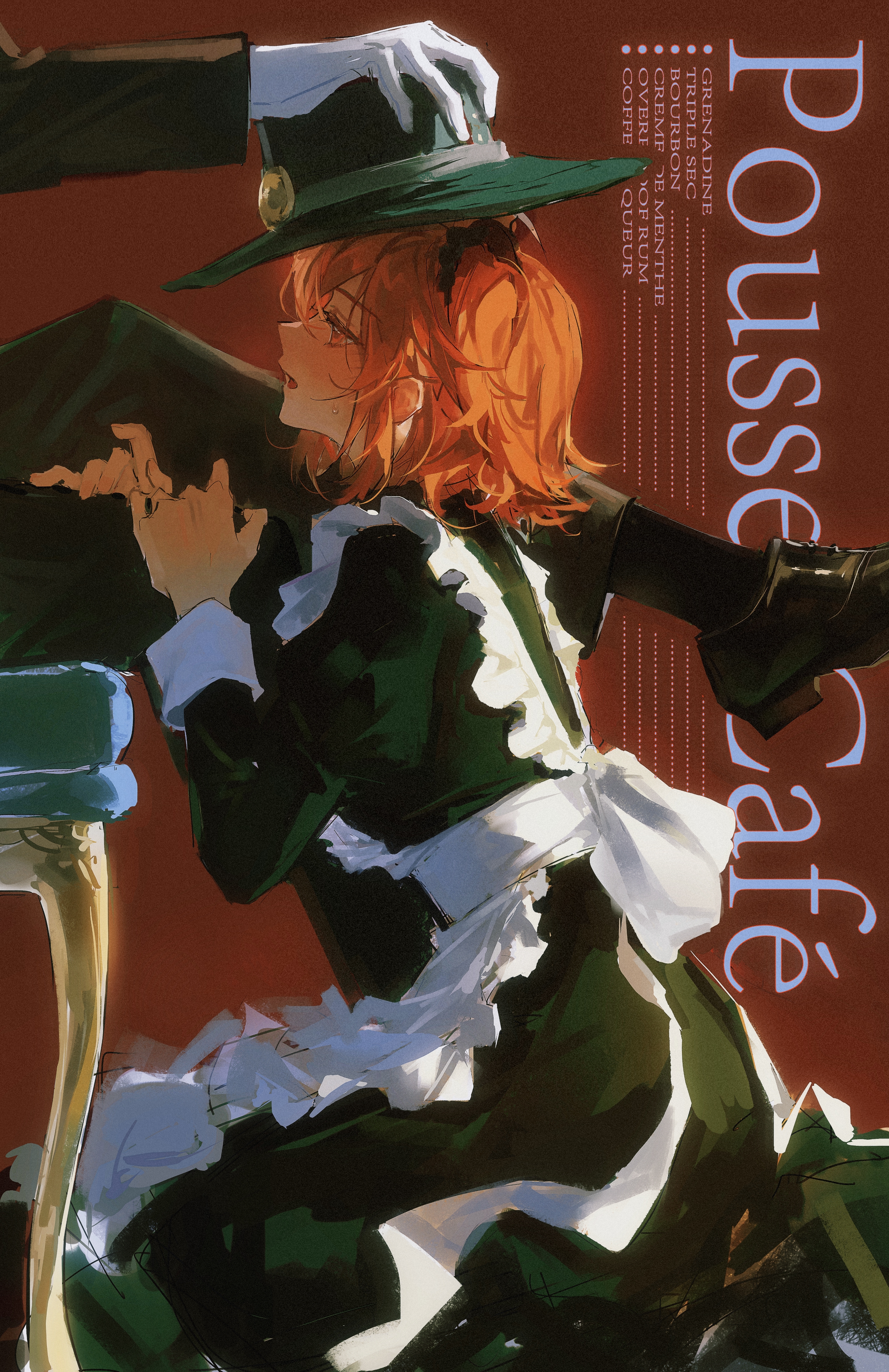 1boy1girlalternate costumeapronblack dressblushchairdressenmaidedfrilled apronfrillsgloveshair ornamenthair scrunchiehatheteroholdingholding unworn clothesholding unworn hatjuliet sleeveslong sleevesmaidmaid apronon chairon floorone side upopen mouthorange eyesorange hairpantsprofilepuffy sleevesred backgroundscrunchieseizashoessittingsweatdropunworn hatunworn headwearwhite apron