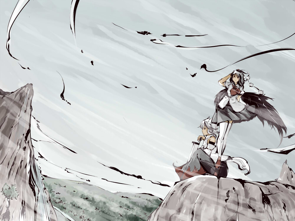 2girlsanimal earsblack hairblack wingsdaydetached sleevesfemale focuslandscapemountainmultiple girlsskirtskyswordtailthighhighsweaponwhite hairwindwind liftwingswolf earswolf tailzettai ryouiki