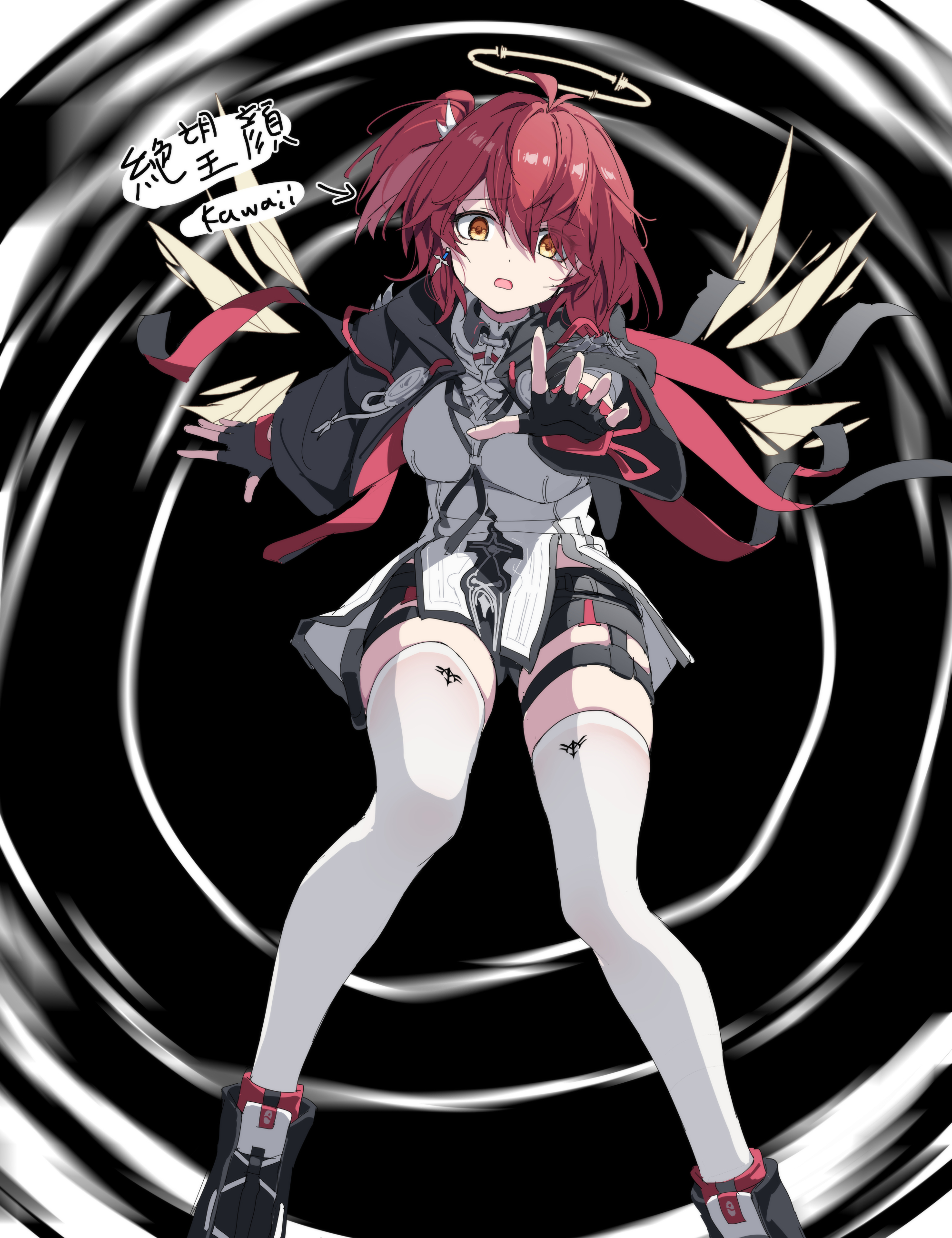 1girlblack glovesbreastscloakfallingfingerless glovesglovesgluteal foldhalolong hairlooking at viewermedium breastsred hairshirtshoesshortsside ponytailskindentationsneakerssolostandingthigh strapthighhighswhite shirtwhite thighhighs
