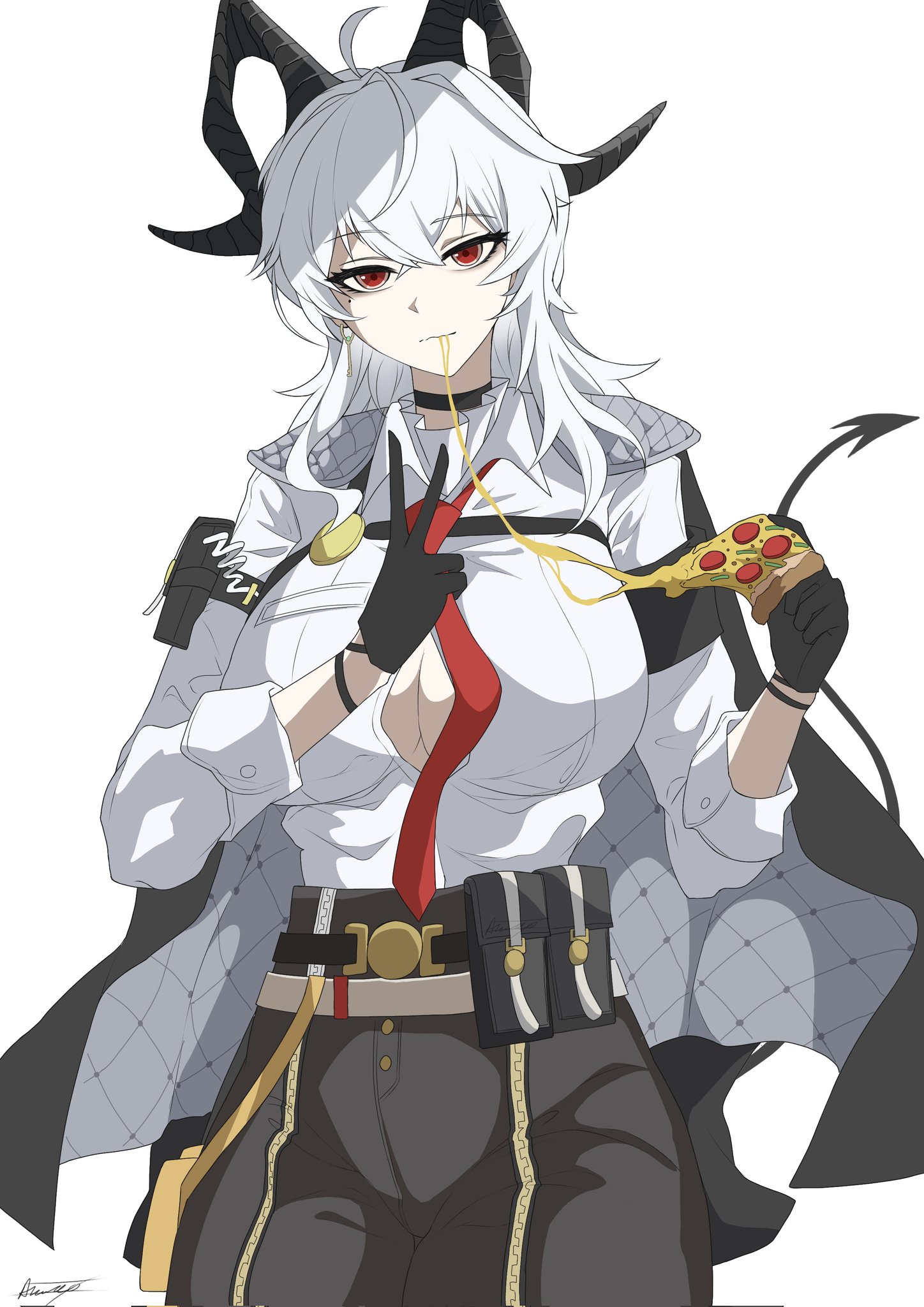 1girlahogeblack chokerblack hornsblack jacketblack pantsbreastsbutton gapcheesecheese trailchest harnesschokerclosed mouthcollared shirtcowboy shotcurled hornsearringsfoodharnessholdingholding foodholding pizzahornsjacketjacket on shouldersjewelrykey earringslarge breastslong hairlooking at viewernecktiepantspizzared eyesred necktieshirtshirt tucked insimple backgroundsolovwhite backgroundwhite hairwhite shirt