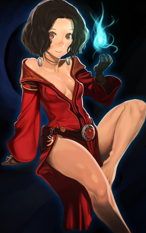 1girlbare shouldersbarefootblack hairbreastscleavageearringsfemale focusgradient backgroundjewelrymagicno lineartopen clothesopen shirtshirtshort hairsmall breastssolo