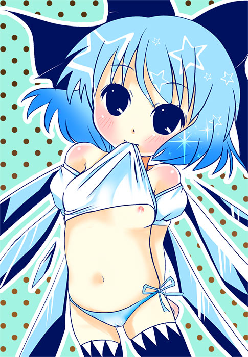 1girlbare shouldersblue hairblushbowbreastscameltoeclothes liftfemale focusgradient hairhair bowlolimouth holdmulticolored hairnipplesno pantspantiesshirt liftshort hairside-tie pantiessmall breastssolothighhighsunderwearwings