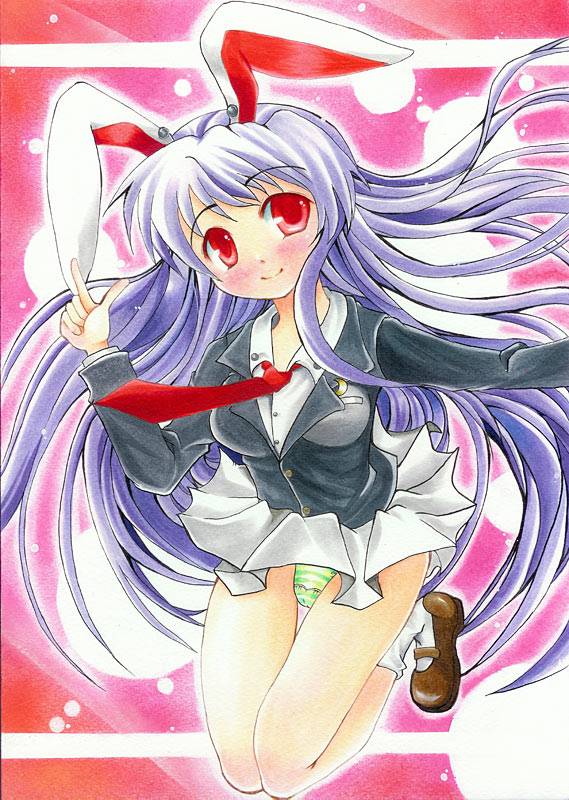 1girlanimal earsblushbreastsfemale focusfull bodygradient backgroundlong hairpantiesrabbit earsred eyesskirtsolounderwear