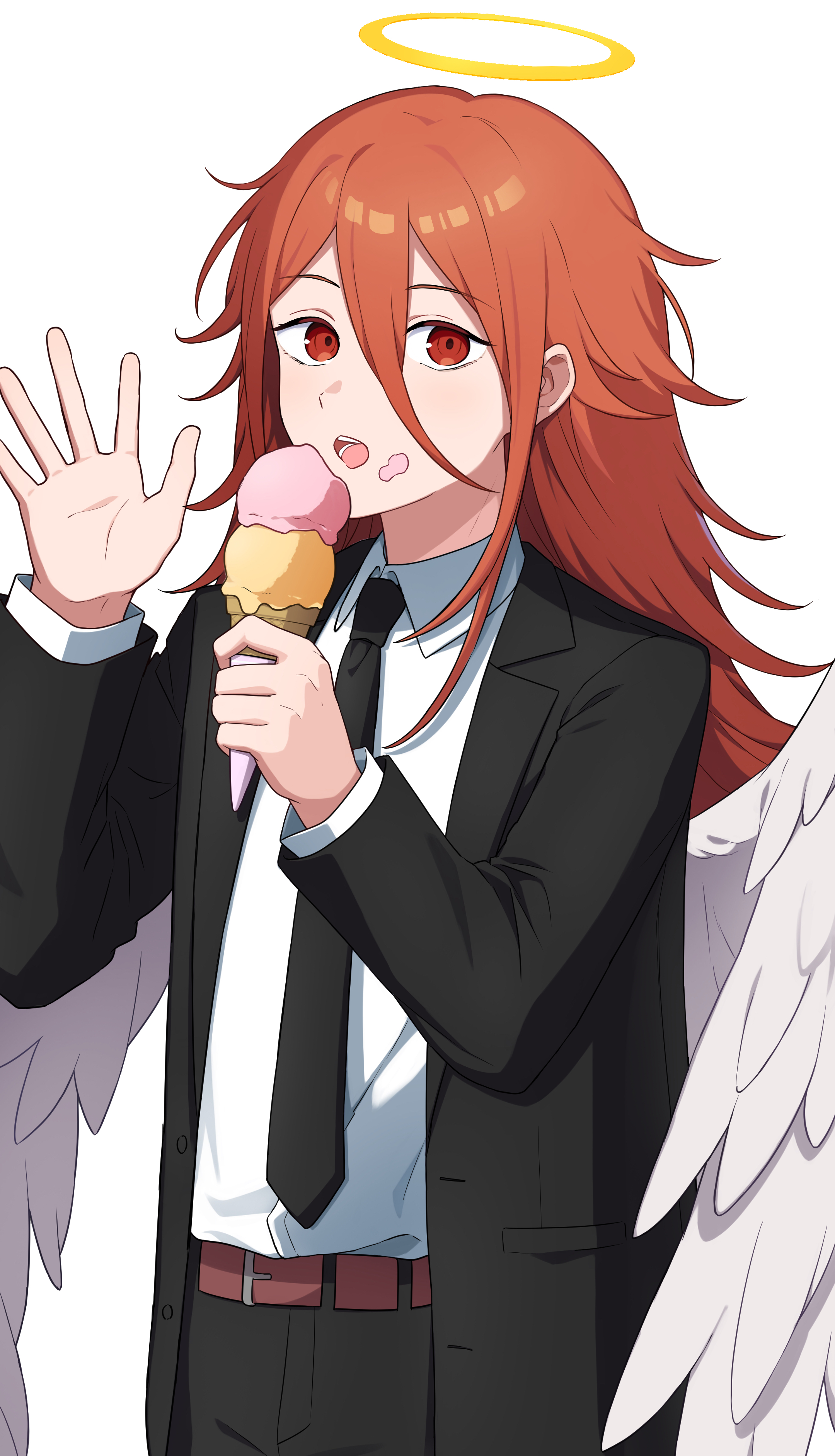 :o1boyangel wingsbeltblack jacketblack necktieblack pantsbrown beltcollared shirtdouble-parted bangsfeathered wingsfoodfood on facehair between eyeshaloholdingholding foodholding ice creamice creamjacketlong hairlong hair between eyeslong sleeveslooking at viewermale focusnecktieopen clothesopen jacketopen mouthorange hairpantsred eyesshirtsolotraditional halowhite shirtwhite wingswings