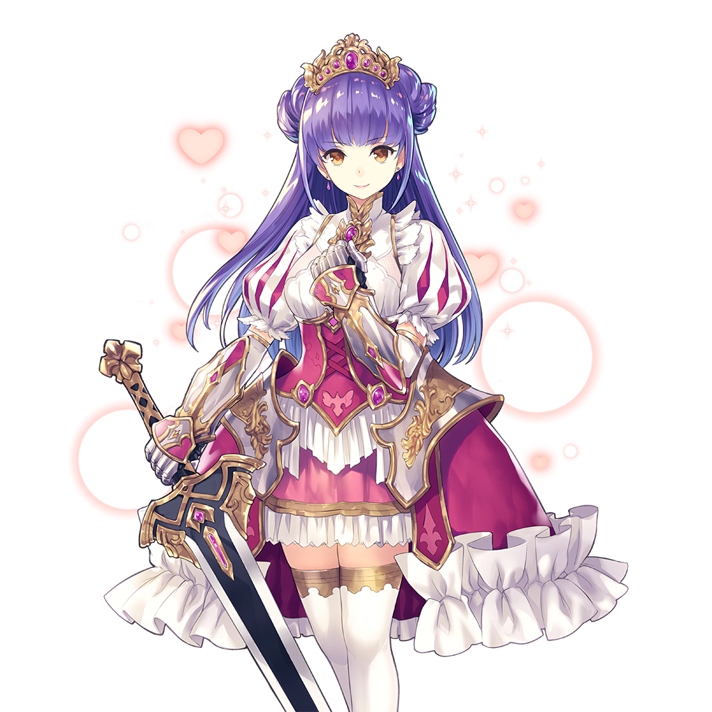 1girlarmorarmored dressarne q kloseblunt bangsclosed mouthdouble bundressearringsfrilled dressfrillsgauntletsgold tiarahair bunholdingholding swordholding weaponjewelrylong hairpuffy short sleevespuffy sleevespurple hairshort sleevesswordthighhighsweaponwhite thighhighsyellow eyes