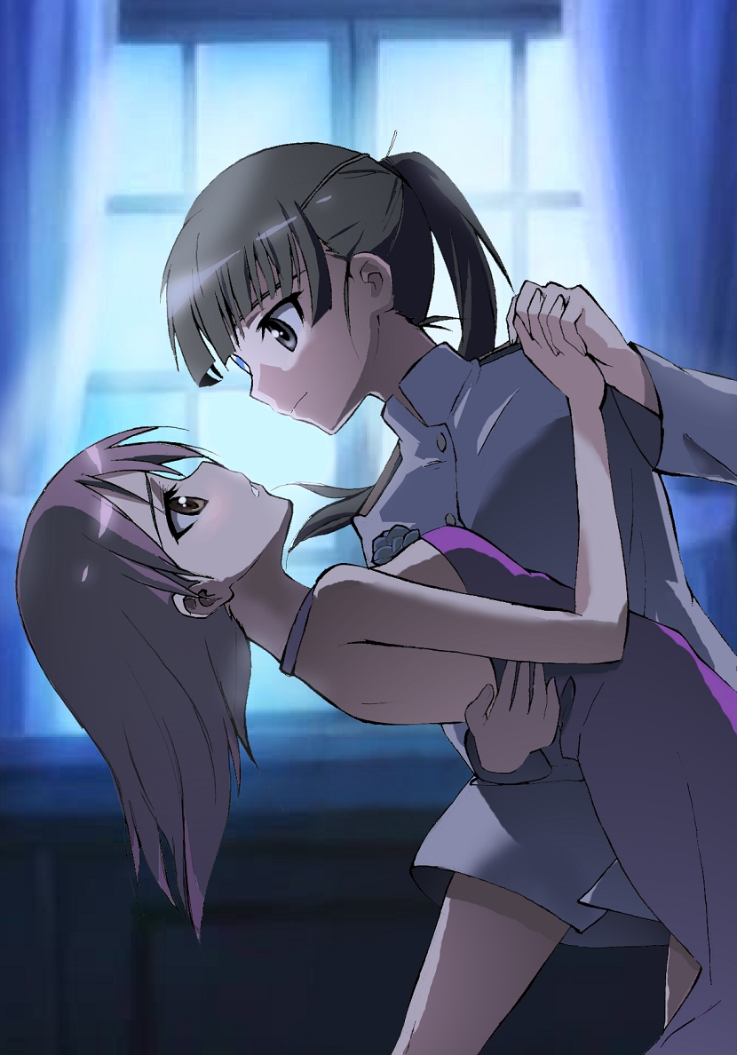 00s2girlsblack hairblushdancingdresseyepatchholding handsmilitarymilitary uniformmultiple girlsred hairyuri