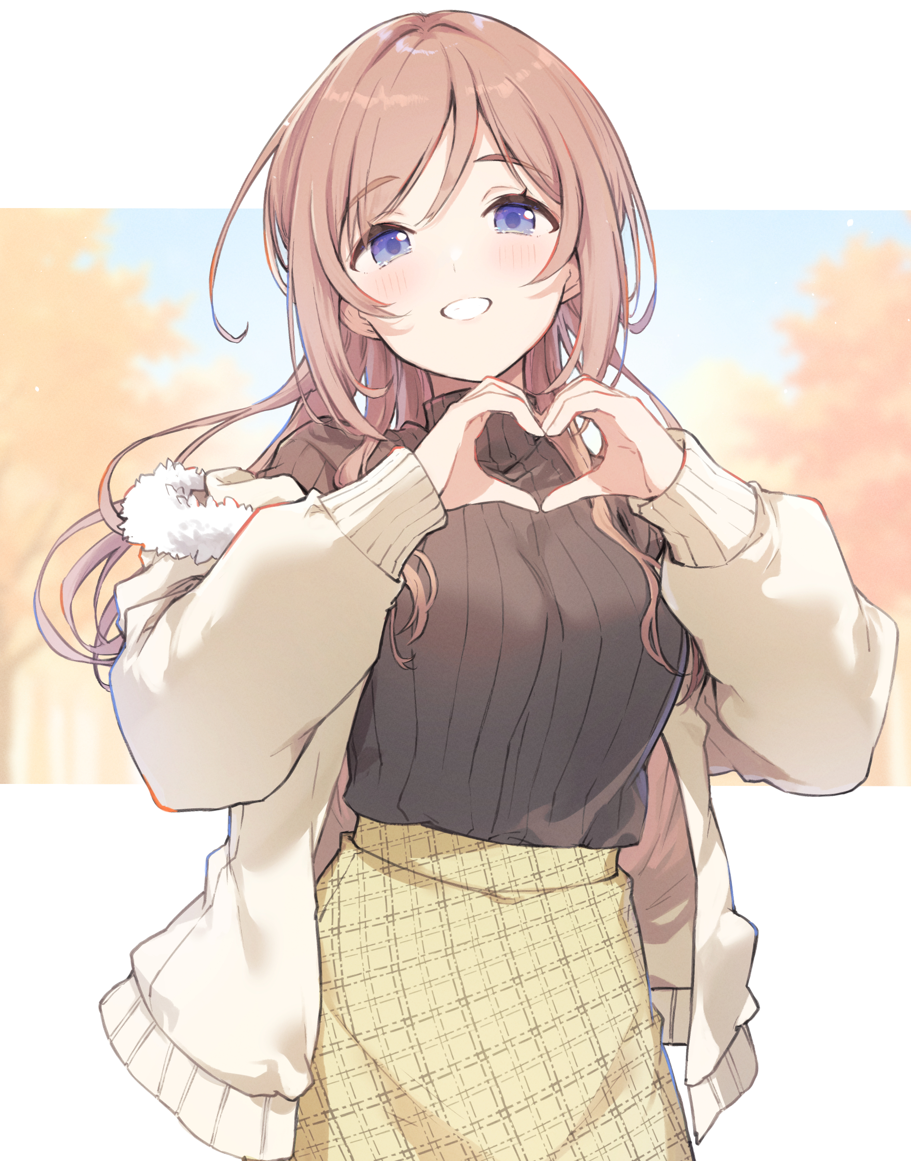 1girlblue eyesblushbrown hairbrown sweatercowboy shotheartheart handsjacketlong hairlong sleeveslooking at vieweropen clothesopen jacketribbed sweaterskirtsmilesolosweaterturtleneckturtleneck sweaterwhite jacketyellow skirt