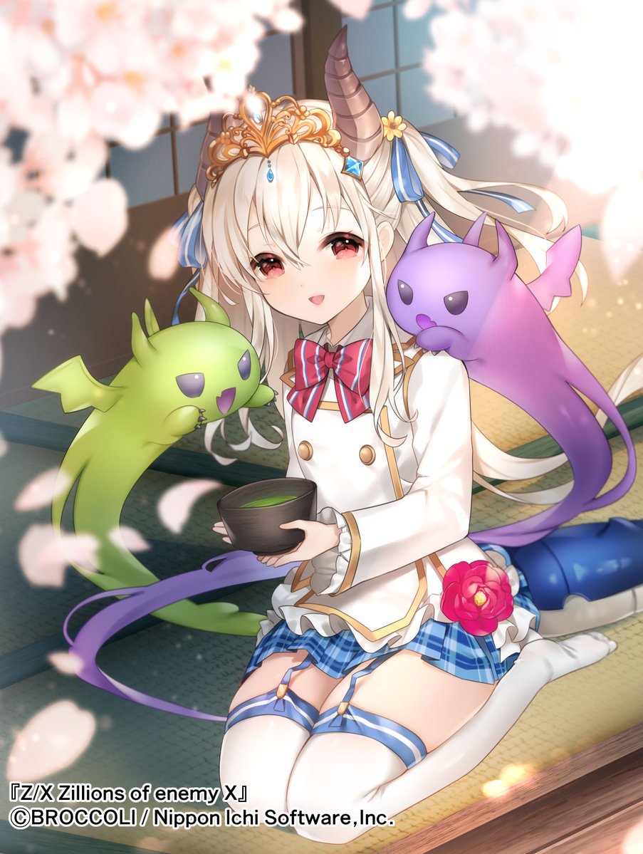 1girlblue skirtbowbowtiebrown hornscherry blossomscopyright noticecrowncupdragon hornsflowergreen teahair between eyeshair bowhair flowerhair ornamentholdingholding cuphornslong hairopen mouthpink petalsplaid clothesplaid skirtred bowred bowtiered eyesseizashirtshoujisittingskirtsliding doorssolotatamiteathighhighstwo side upwhite hairwhite shirtwhite thighhighsyunomi