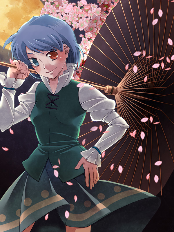 1girlblue eyesblue hairfemale focusflowerhand on own hipheterochromiahip focusmatching hair/eyesmoonoil-paper umbrellapetalsred eyessoloumbrella