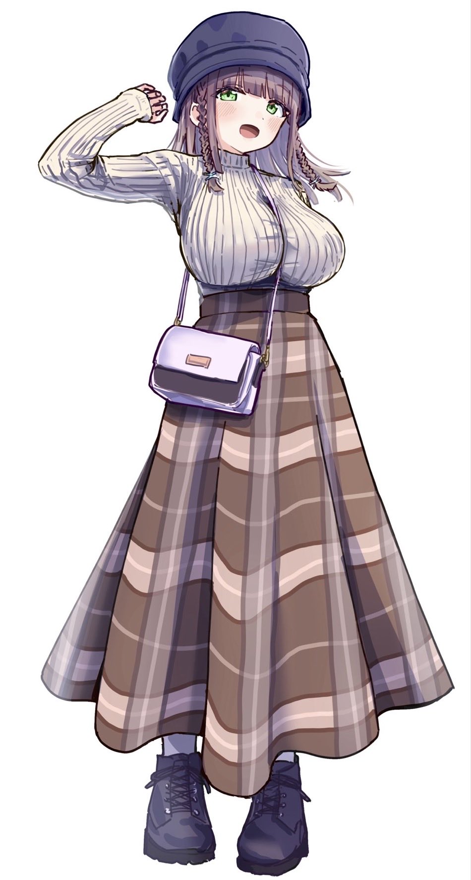 1girlbagbetween breastsblushbraidbreastsbrown hairbrown skirtfull bodygreen eyeshandbaghatiyashigorira12large breastslong hairlong skirtlong sleeveslooking at vieweropen mouthribbed sweatershoessimple backgroundskirtsmilesolostrap between breastssweatertwin braidswhite backgroundwhite sweater