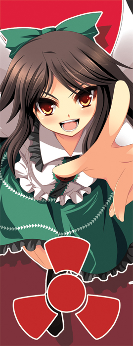 :d1boy1girlbrown hairfemale focuslong hairopen mouthorange eyesoutstretched armoutstretched handradiation symbolreachingsmilesolotsurimev-shaped eyebrows
