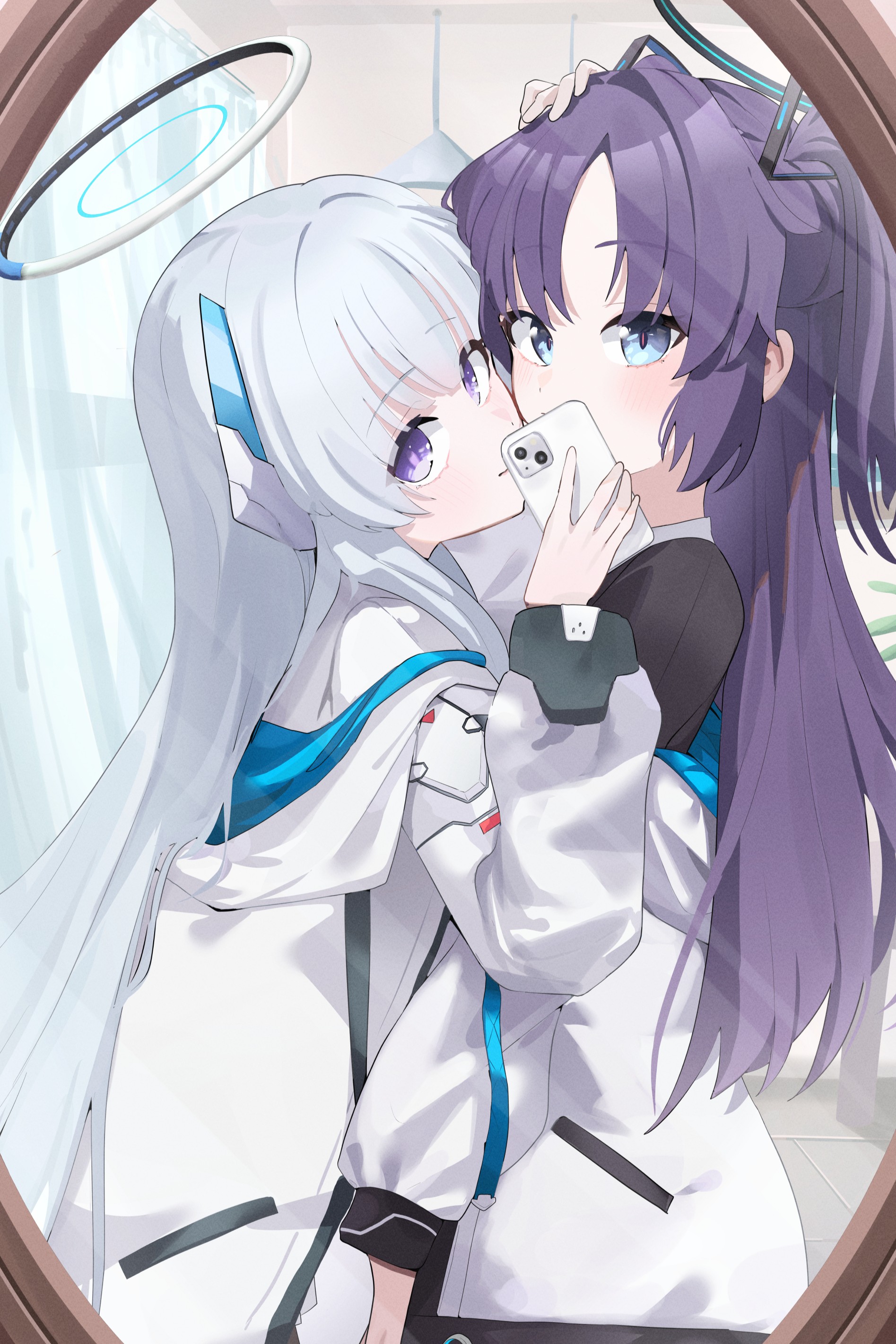 2girlsblushcellphonecheek-to-cheekgrey hairhaloheadgearheads togetherholdingholding phoneindoorsjacketlong hairlooking at viewermirrormultiple girlsphonepurple eyespurple hairreflectionreflection focusselfiesmartphonevery long hairwhite jacketyuri