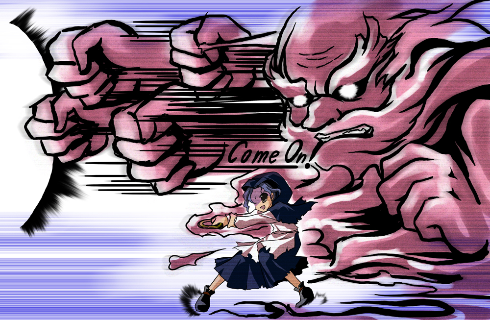 arle nadja, nakoruru, puyo (puyopuyo), madou monogatari, puyopuyo, samurai spirits, snk, the king of fighters, highres, traditional media, translation request, 1girl, alternate costume, breasts, brown eyes, cosplay, fingerless gloves, gloves, hair ribbon, japanese text, large breasts, long hair, looking at viewer, outstretched arm, pink lips, ponytail, red hair, ribbon, shirt, smile, solo