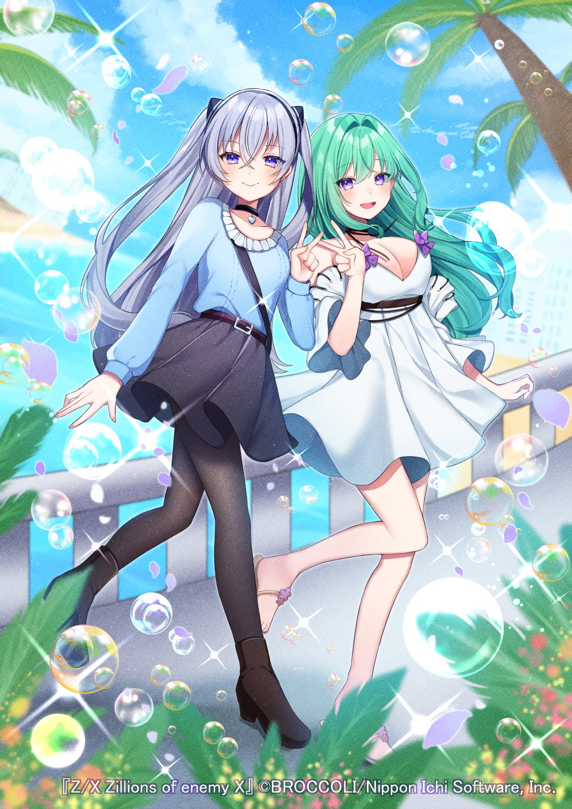 2girlsbeltbetween breastsblack beltblack chokerblack pantyhoseblack shoesblack skirtblue shirtblue skybowbreastsbubblechokercleavagecloudcloudy skycopyright noticedressdress bowgreen hairgrey hairhair between eyesheartheart chokerlarge breastslong hairlooking at viewermedium breastsmultiple girlsnu (z/x)outdoorspalm treepantyhosepurple bowpurple eyesrailingsandalsshirtshoesskirtskysparklestandingstanding on one legstrap between breaststreetwo side upvwhite dress