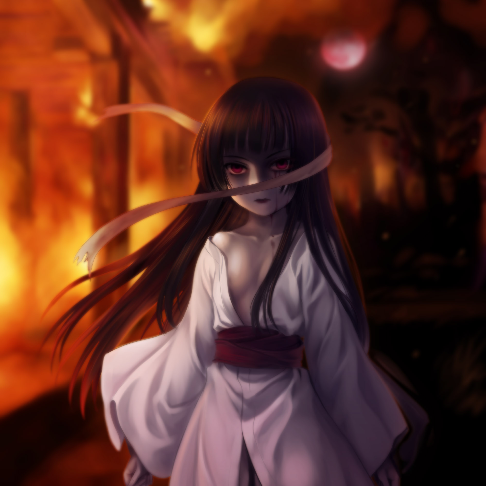 00s1girlblack hairbloodblunt bangsfemale focusfireflat chesthime cutjapanese clotheskimonomoonopen clothesopen kimonored eyesred moonribbonsolo