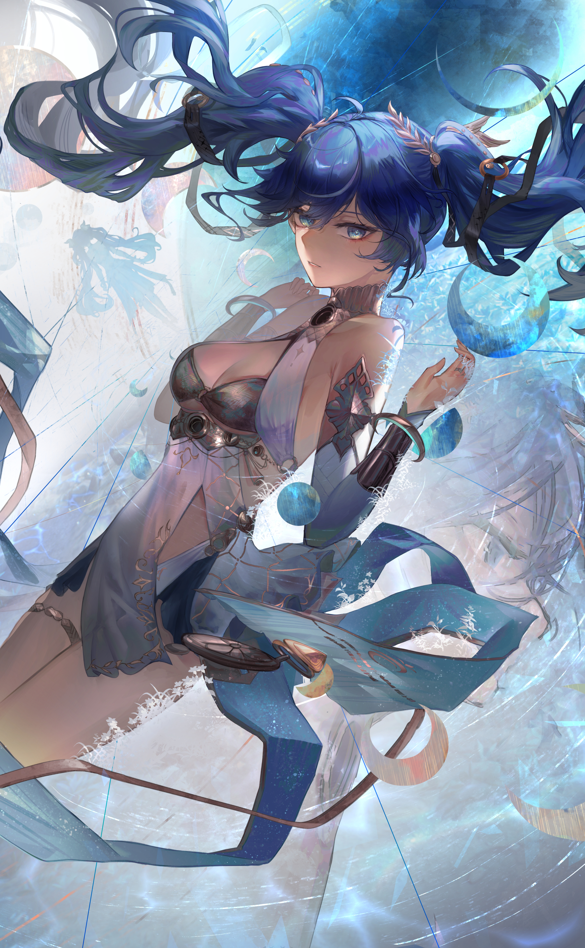diao chan, shin sangoku musou, absurdres, highres, scan, 1girl, bare shoulders, black gloves, black hair, black thighhighs, blue eyes, brown hair, cowboy shot, crop top, elbow gloves, female focus, floral background, flower, gloves, hair flower, hair ornament, hair rings, long hair, looking to the side, midriff, navel, parted lips, pink lips, purple flower, purple rose, rose, sarong, sleeveless, solo, standing, stomach, thighhighs