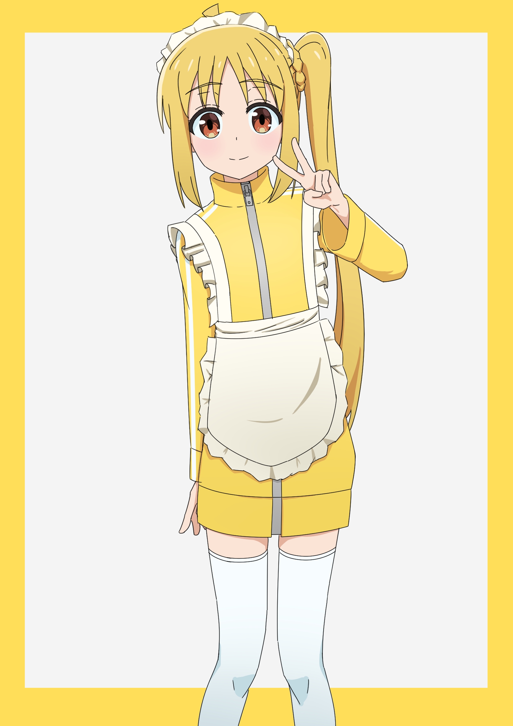 1girlalternate costumeapronblonde hairborderclosed mouthdressenmaidedfeet out of framehand upjacketjersey maidkneehighslong hairlong sleevesmaidmaid headdressorange eyesshort dressside ponytailsidelockssimple backgroundsmilesockssolothighhighstrack jacketunconventional maidvvery long hairwhite backgroundwhite thighhighsyellow borderyellow dressyellow jacketzettai ryouiki