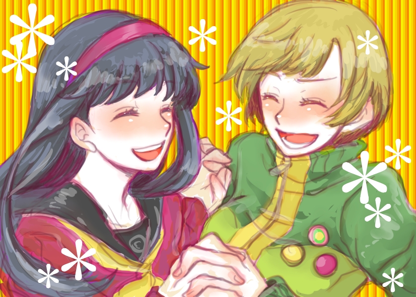 2girlsblack hairbrown hairfemale focushairbandholding handsjacketlapel pinlong hairmultiple girlssailor collarshort hairsmiletrack jacket