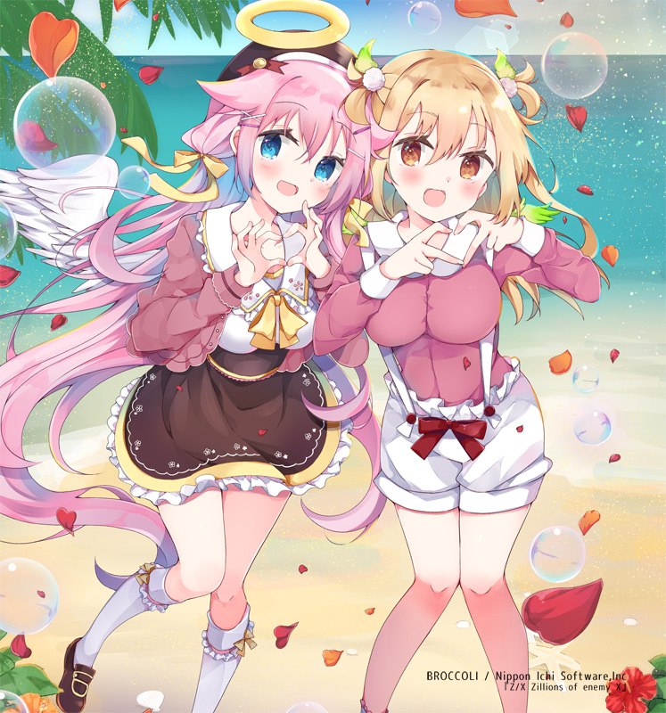 2girlsbeachblonde hairblue eyesbrown hatbrown shoesbubblecana (z/x)copyright noticefeathered wingsflowerfour-finger heart handsgreen wingshair between eyeshair ornamenthair ribbonhalohatheartheart handshibiscusjacketlong hairmarie (z/x)multicolored hairmultiple girlsoceanopen clothesopen jacketopen mouthoutdoorspink hairpink jacketpink shirtpom pom (clothes)pom pom hair ornamentred petalsribbonshirtshoesshortsthighhighstraditional halotwo side upwhite shirtwhite shortswhite thighhighswhite wingswingsyellow eyesyellow ribbon