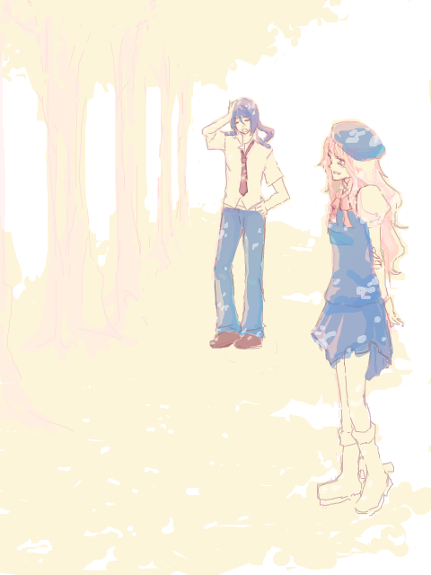 00s1boy1girlbare shouldersberetblack hairblonde hairblue dressdressfull bodyhatlong hairoutdoorspantsplantstandingtreewavy hair