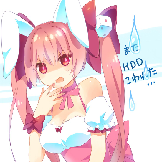 1girlanimal earsbowbreastscleavagedicefemale focushair ornamentlarge breastspink hairrabbit earsred eyessolosweatdroptwintailswaitress