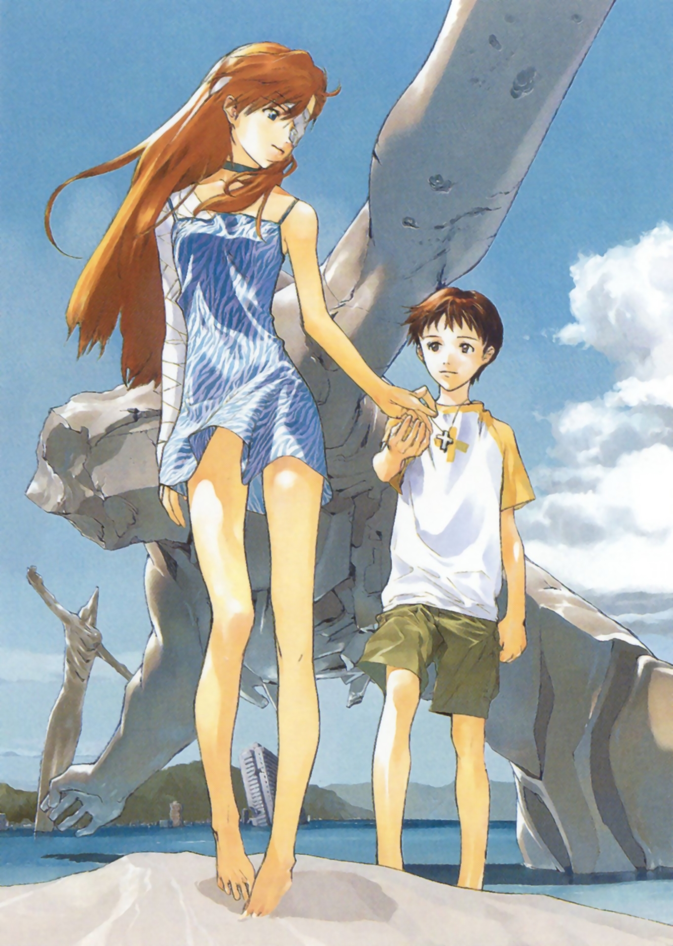 1990s (style)1boy1girlbandagesbarefootblue eyesbrown hairchokercouplecrossdresseyepatchfeetheteroholding handsjewelrylong hairnecklaceorange hairraglan sleevesred hairshorts