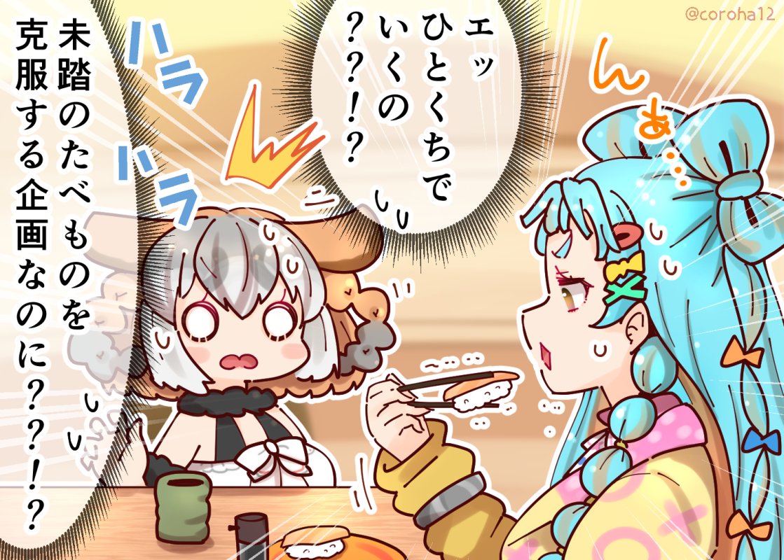 hisarakanoi, nami (one piece), nico robin, one piece, commentary request, highres, 2girls, black hair, blue dress, blue eyes, blunt ends, choker, dress, earrings, eye contact, eyelashes, frilled choker, frilled gloves, frills, gloves, jewelry, looking at another, medium hair, multiple girls, necklace, orange eyes, orange hair, puffy short sleeves, puffy sleeves, short hair, short sleeves, smile, upside-down