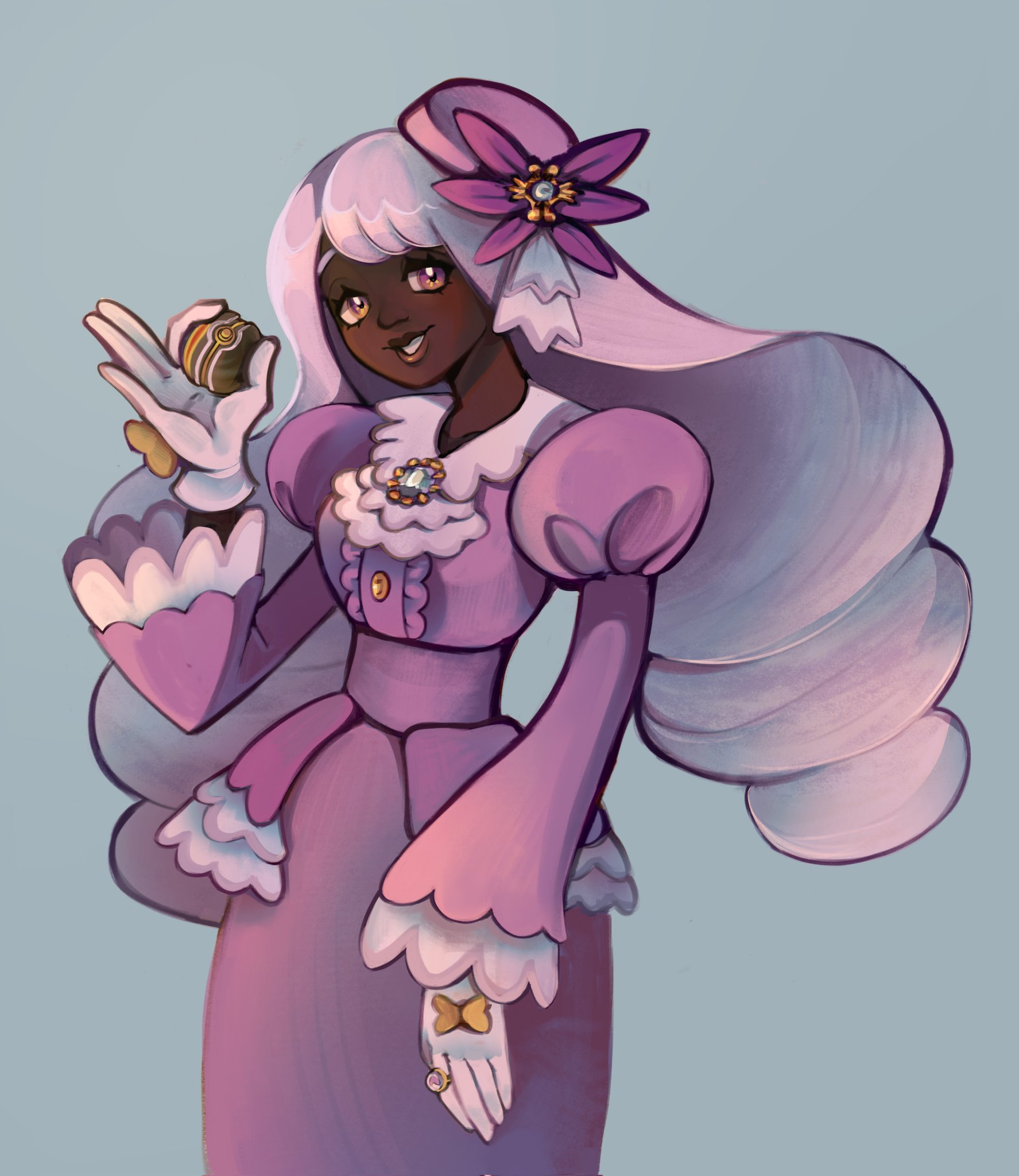 1girlascotcowboy shotdark skindark-skinned femaledressfascinatorfrilled ascotfrilled sleevesfrillsglovesgold ringholdingholding poke balljuliet sleeveslipslong hairlong sleeveslooking at viewerluxury ballparted lipspoke ballpuffy sleevespurple dresspurple eyespurple hairquisquiliaasmilesolovery dark skinwhite gloves
