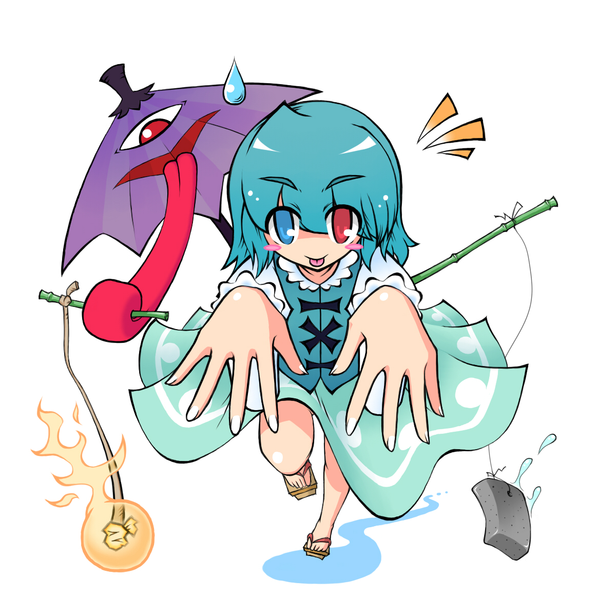 :p1girlblue eyesblue hairfemale focusgetaheterochromiakarakasa obakered eyessandalsshort hairsolotonguetongue outumbrella