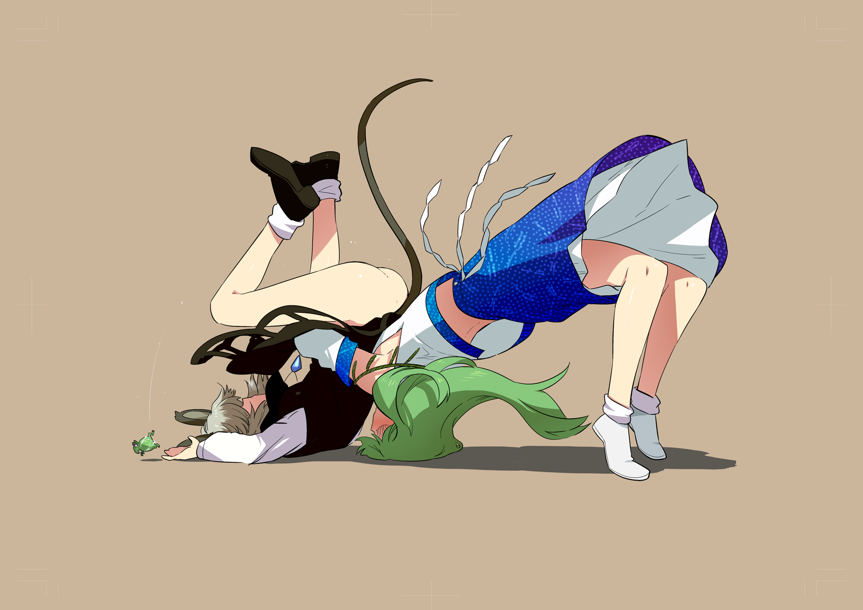 2girlsanimal earsassblushbottomlessfemale focusfroggerman suplexgreen hairmouse earsmouse tailmultiple girlsno pantiesnudesuplextail