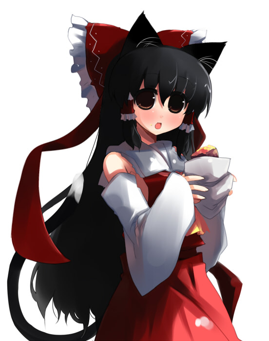 1girlanimal earsblack hairblushbrown eyescat earscat girleatingfemale focusfoodjapanese clotheskemonomimi modelong hairmikoribbonsimple backgroundsolowhite background