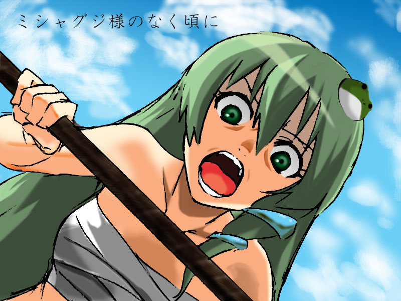 1girlangrybreastschest sarashicloudcrazyfemale focusfroggreen eyesgreen hairhair ornamentopen mouthoutdoorsparodysarashiskysoloupper bodyyandere