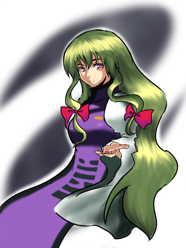 1girlbeckoningblonde hairbowbreastsdressexpressionlessfemale focusgap (touhou)gradient backgroundhair bowlong hairno headwearpurple eyesribbonsolowhite background