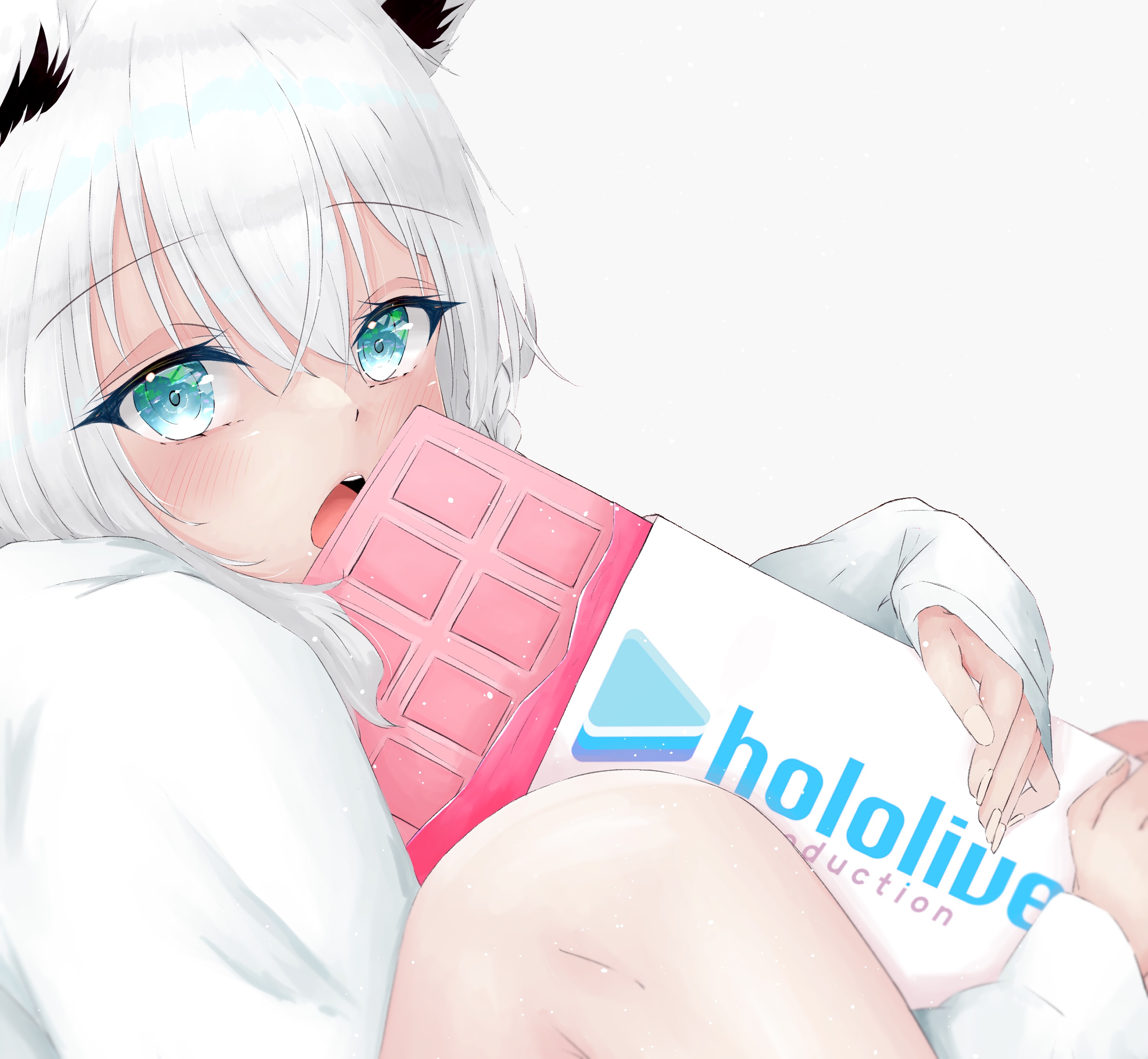 :o1girlanimal ear fluffanimal earsaqua eyeschocolatefoodfox earsfox girlhair between eyesholdingholding chocolateholding foodjacketlight blushlong hairlong sleeveslooking at vieweropen mouthsimple backgroundsolovalentinevirtual youtuberwhite hairwhite jacket