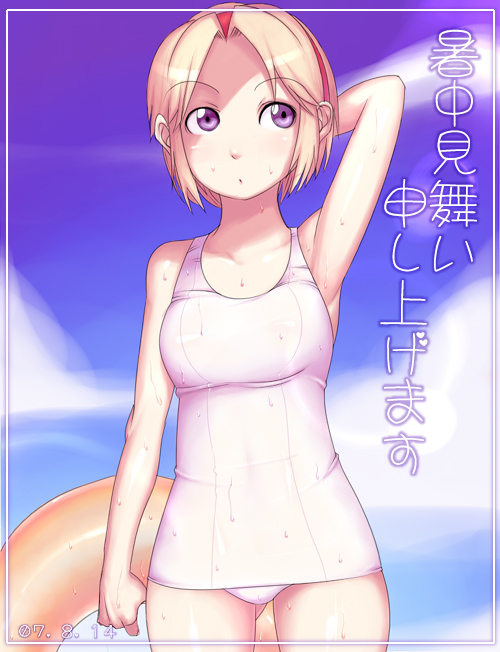 1girlaged uparmpitsbeachblonde hairblue eyesbreastsclouddayfemale focushairbandinnertubemedium breastsone-piece swimsuitoutdoorsschool swimsuitshort hairskysoloswim ringswimsuitwetwhite one-piece swimsuitwhite school swimsuit