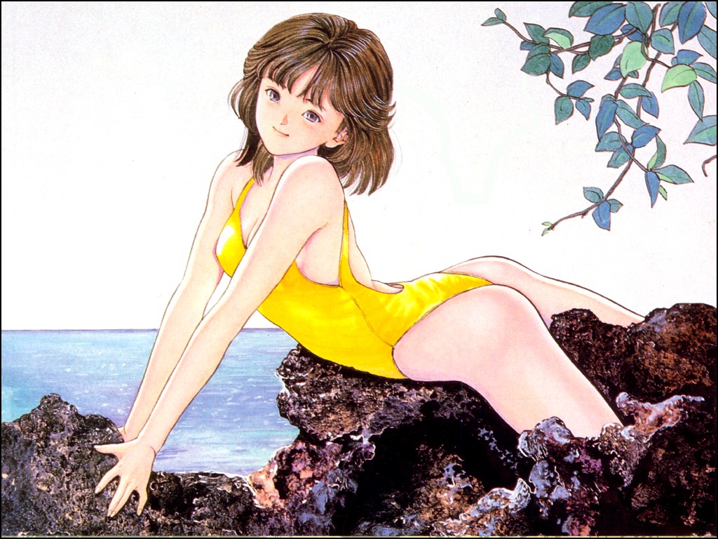 1990s (style)1girlassbrown eyesbrown hairfemale focusoceanone-piece swimsuitrealisticred eyesretro artstylerockshort hairsoloswimsuit