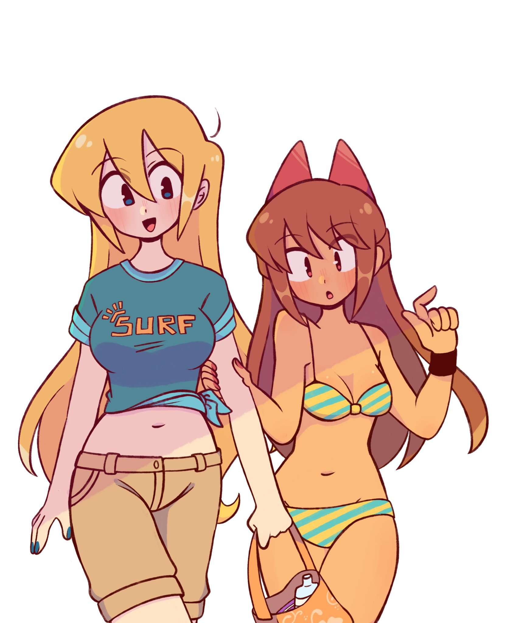 2girlsbagbikiniblonde hairblue bikiniblue eyesblue nailsblue shirtblushbowbreastsbrown eyesbrown hairbrown shortscleavagecrop topdark skindark-skinned femalediagonal-striped bikinidiagonal-striped clothesdouble-parted bangshair between eyeshair bowholdingholding baglong hairmulticolored bikinimultiple girlsnavelparted lipsred bowred nailsshirtshort sleevesshortssidelockssimple backgroundsmall breastssmilestriped bikinistriped clothesswimsuitwhite backgroundyellow bikini