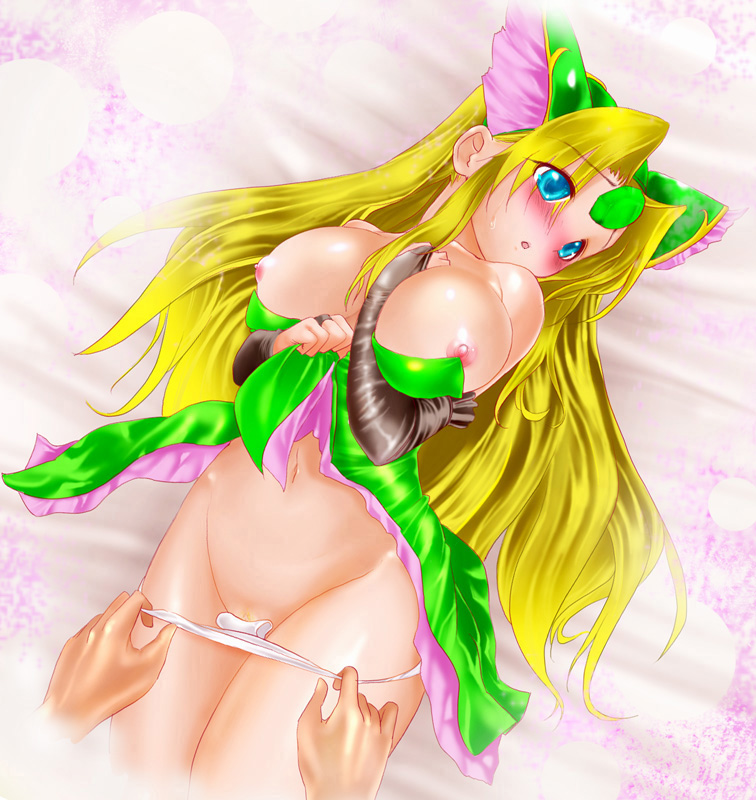 1girlbedblonde hairblue eyesblushbreastsbridal gauntletsdetached sleeveselbow glovesgloveshead wingshelmetheterolarge breastslong hairlyingpantiespanty pulluncensoredunderwearundressingwinged helmetwings